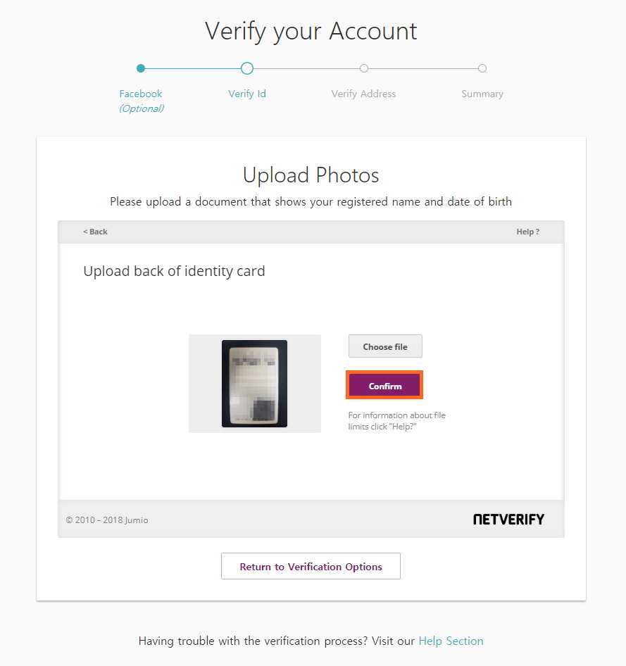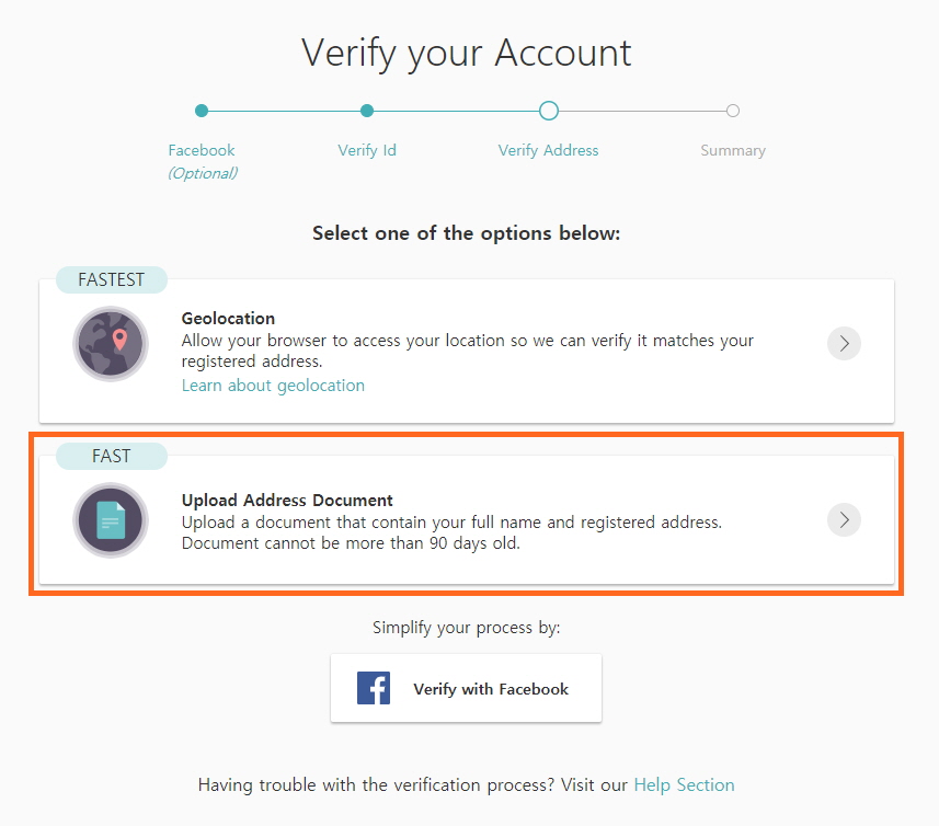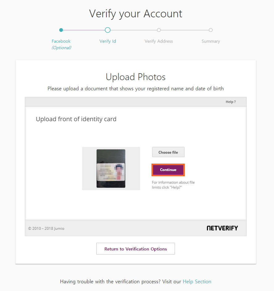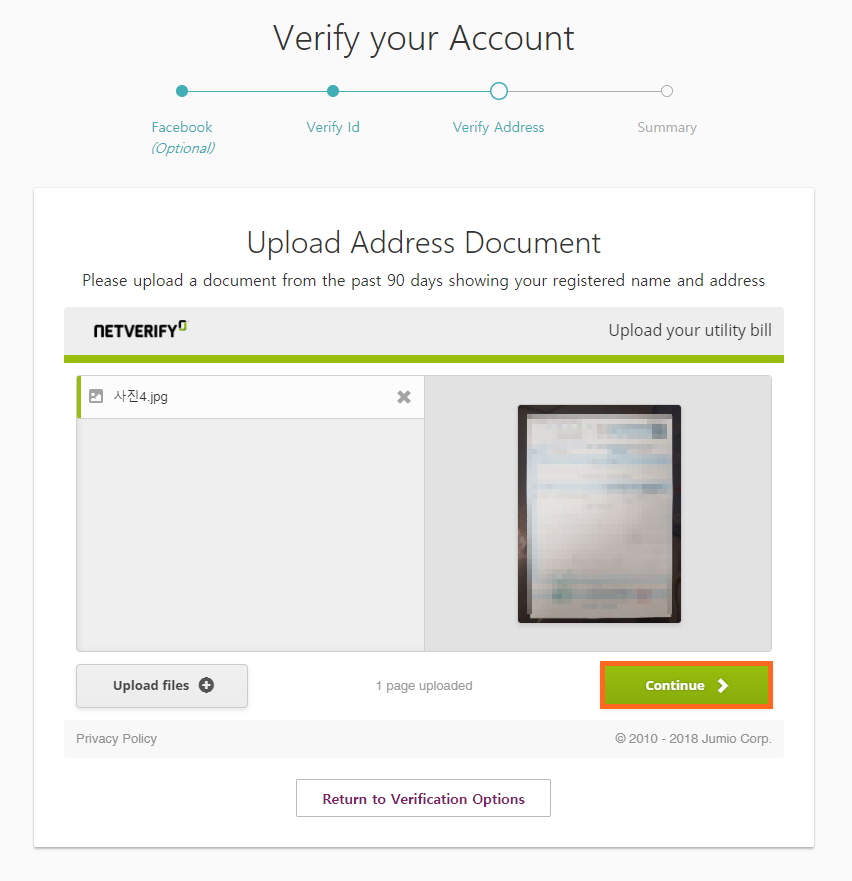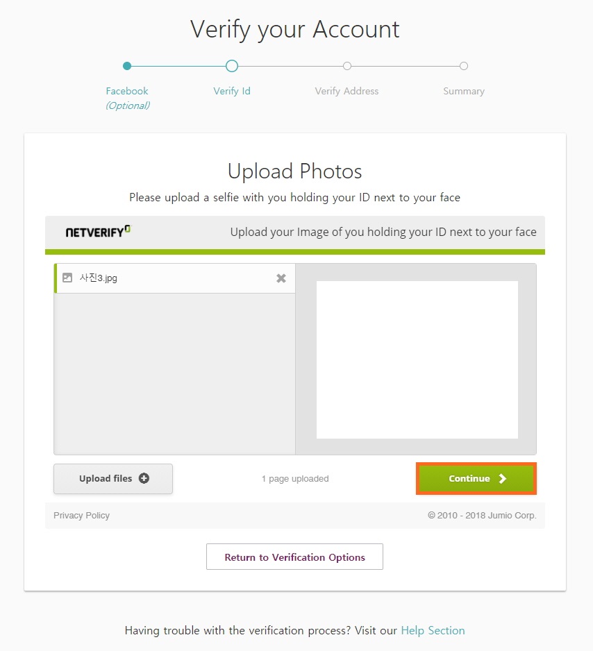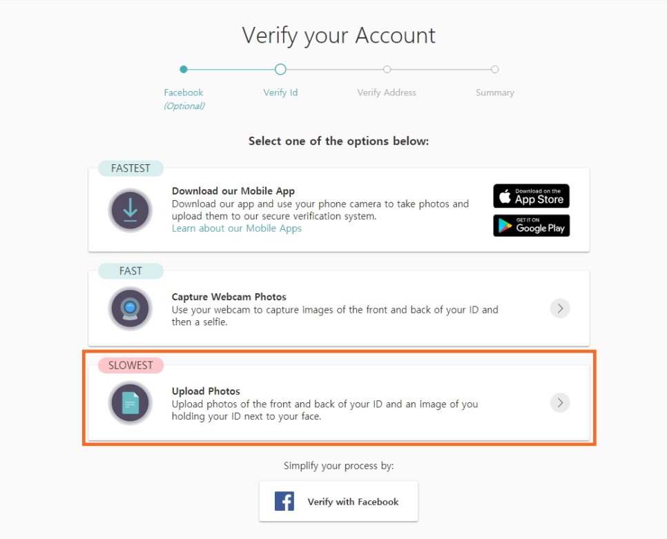 인증은 Upload Photos를 선택하시면 됩니다. (가장 느리다고 적혀있어도 대부분 1-2일내에 인증이 완료됩니다. 주말제외)